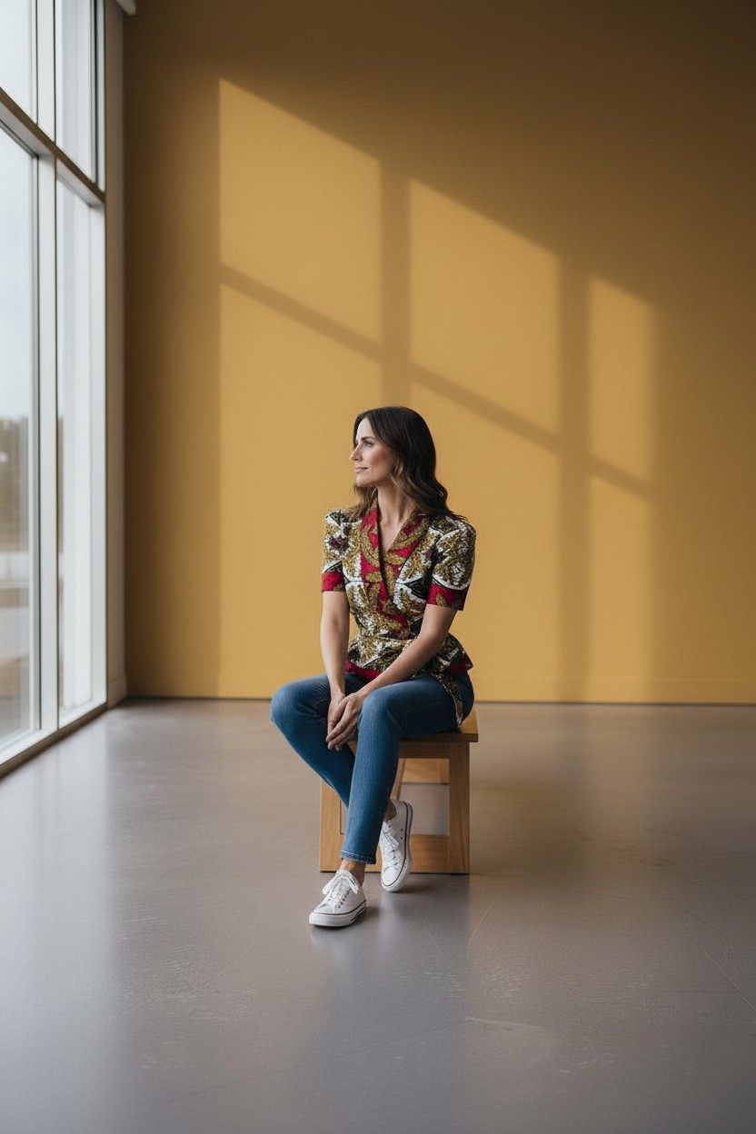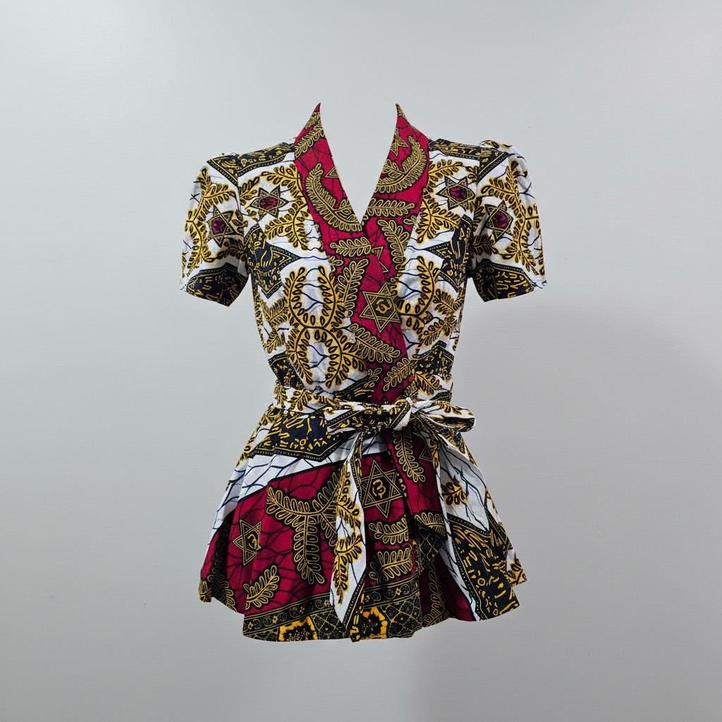The Tinka top is a conversational piece. This top is versatile, it features high collar than can be worn as is or folded down. You can style the top front as back and vice-versa. It also has short sleeves.